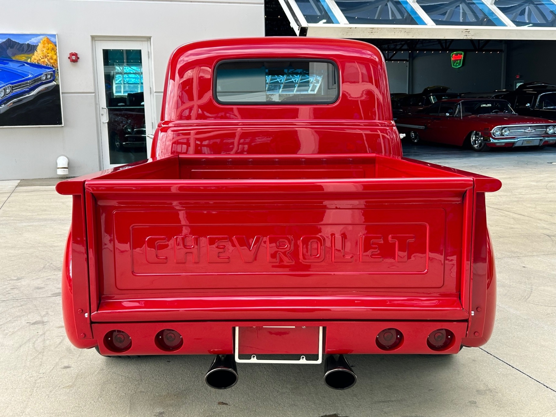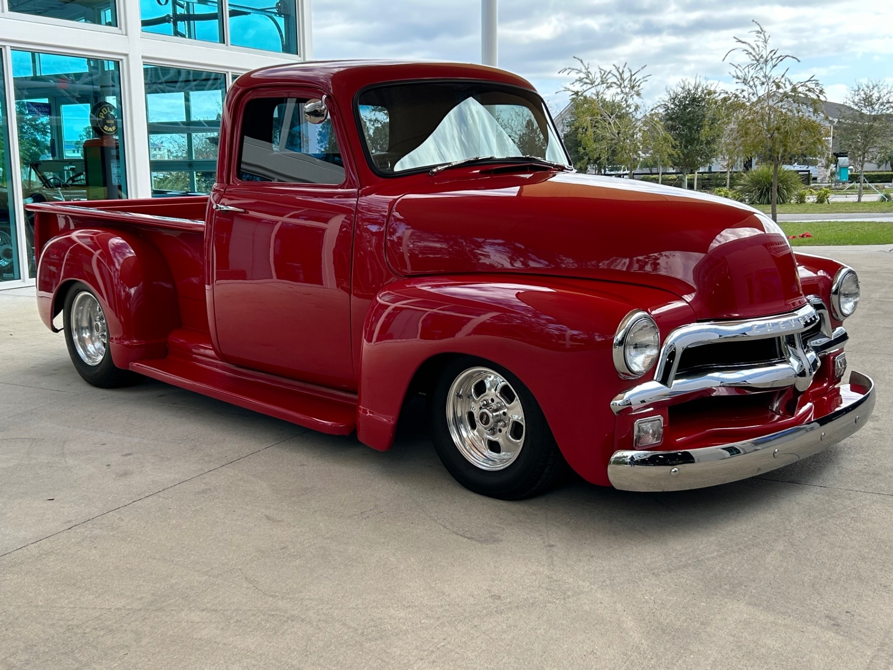 The bright Vermillion Red paint gleams with PPG code 72 Base Coat clear coat finish. The truck is outfitted with an LMC electric cowl vent, roll pan, wood bed kit, and relocated gas tank and battery for a smooth, clean appearance. Polished mag wheels and black sidewall tires complete the look, perfectly complementing the truck’s flowing step fenders and flawless bodywork.